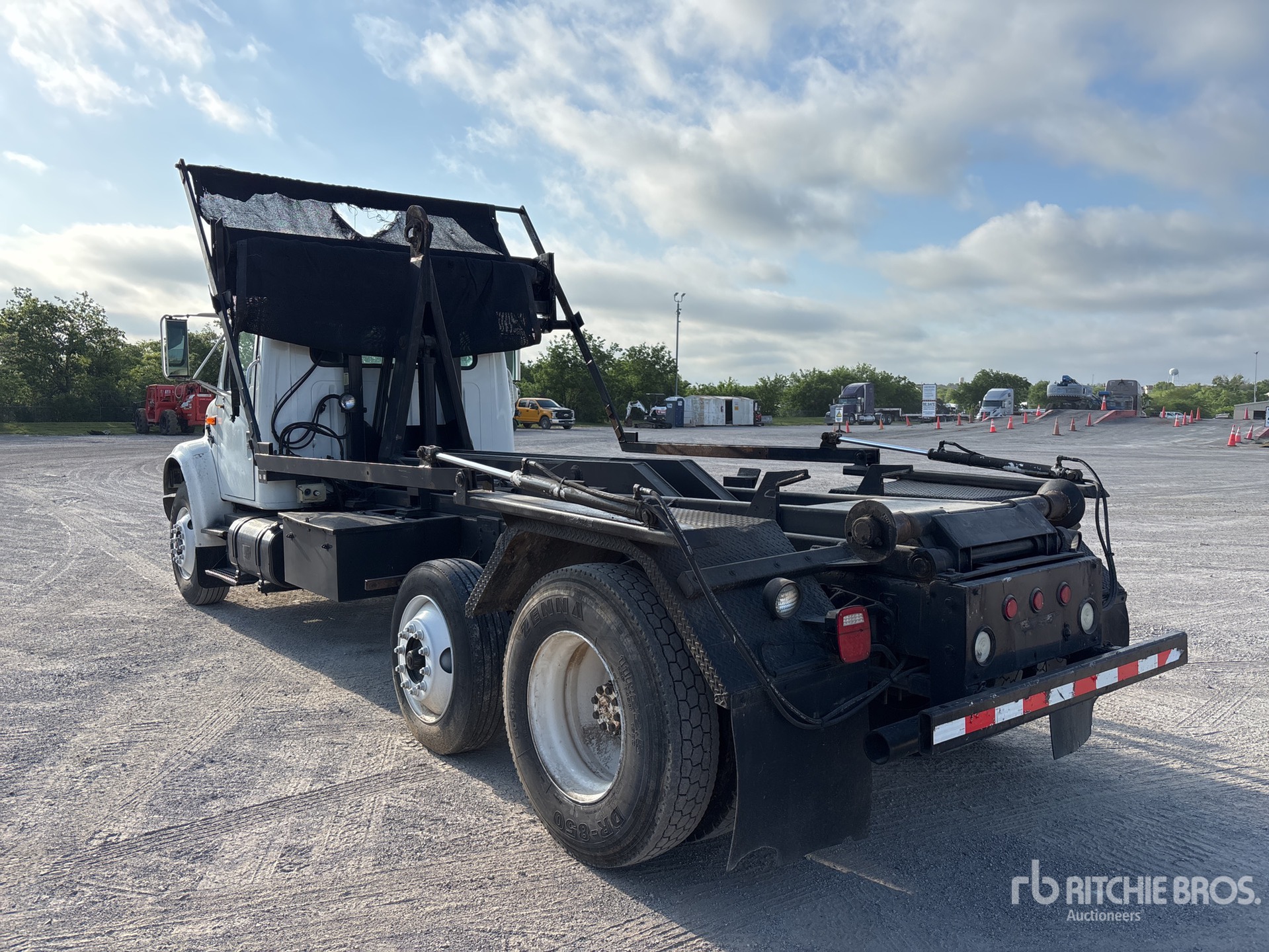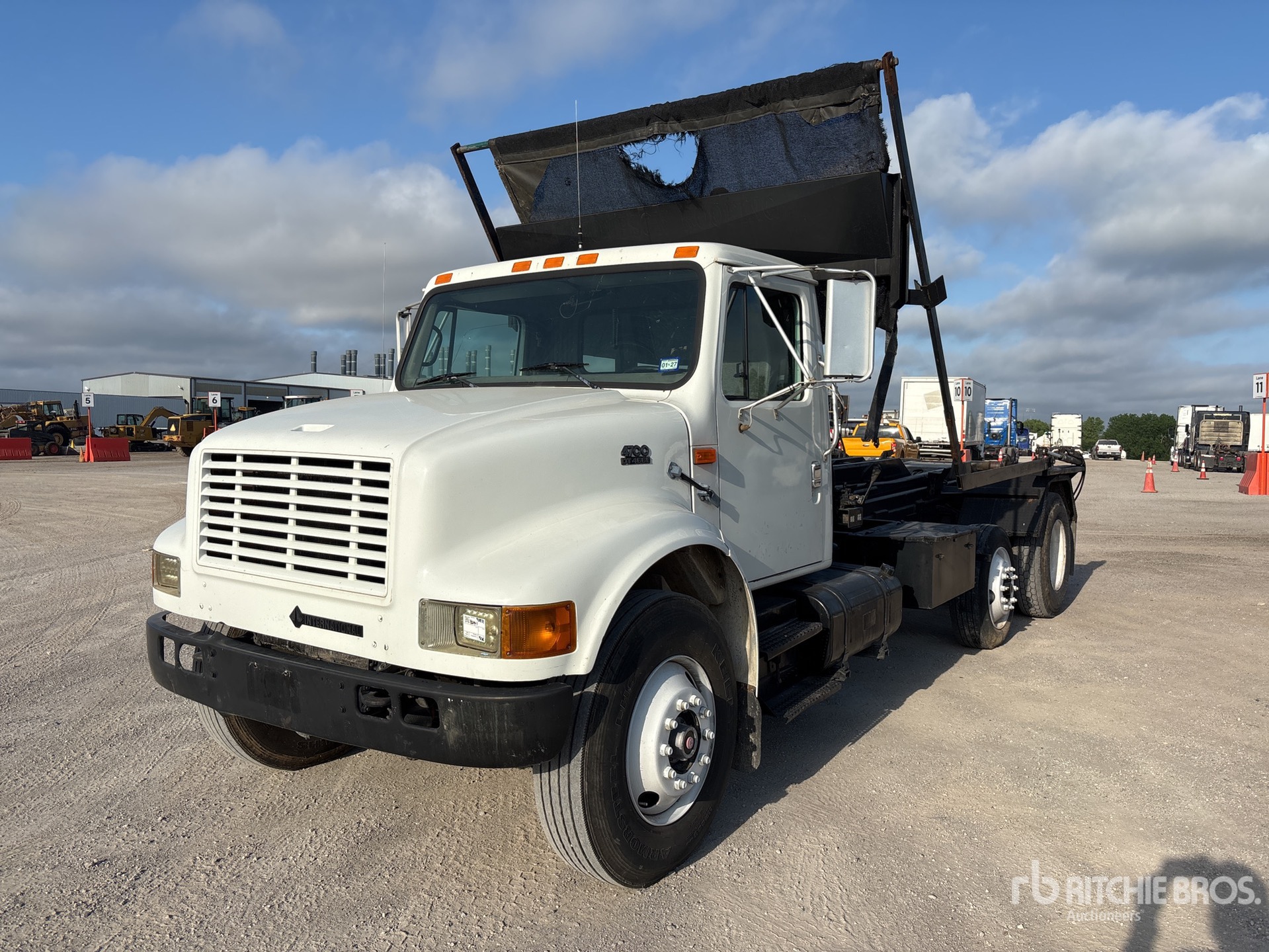 International B230 6 Cylinder 7.6 L Diesel 230 hp Engine, 1999 US EPA Label, International 6-Speed Manual Transmission, 11R22.5, Steerable Air Lift Pusher Axle, Spring Suspension, 225 in Wheelbase, PTO, Stellar 138-18-20T Roll-Off Body, 11 ft 6 in Hoist