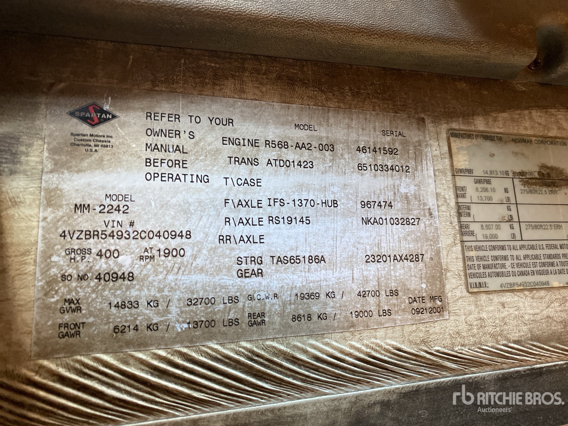 The detailed equipment information is limited in scope, and Ritchie Bros. Auctioneers has not inspected any aspects or components of the equipment other than those expressly set forth herein. Unless expressly stated, we make no representations or warranties, express or implied, concerning the equipment or its components, including without limitation any representations or warranties concerning functionality, conformity or compliance with any safety standard or requirement of any applicable authority or regulatory body, fitness for any particular purpose, or merchantability. You are strongly advised to perform your own detailed inspection of the equipment prior to bidding.