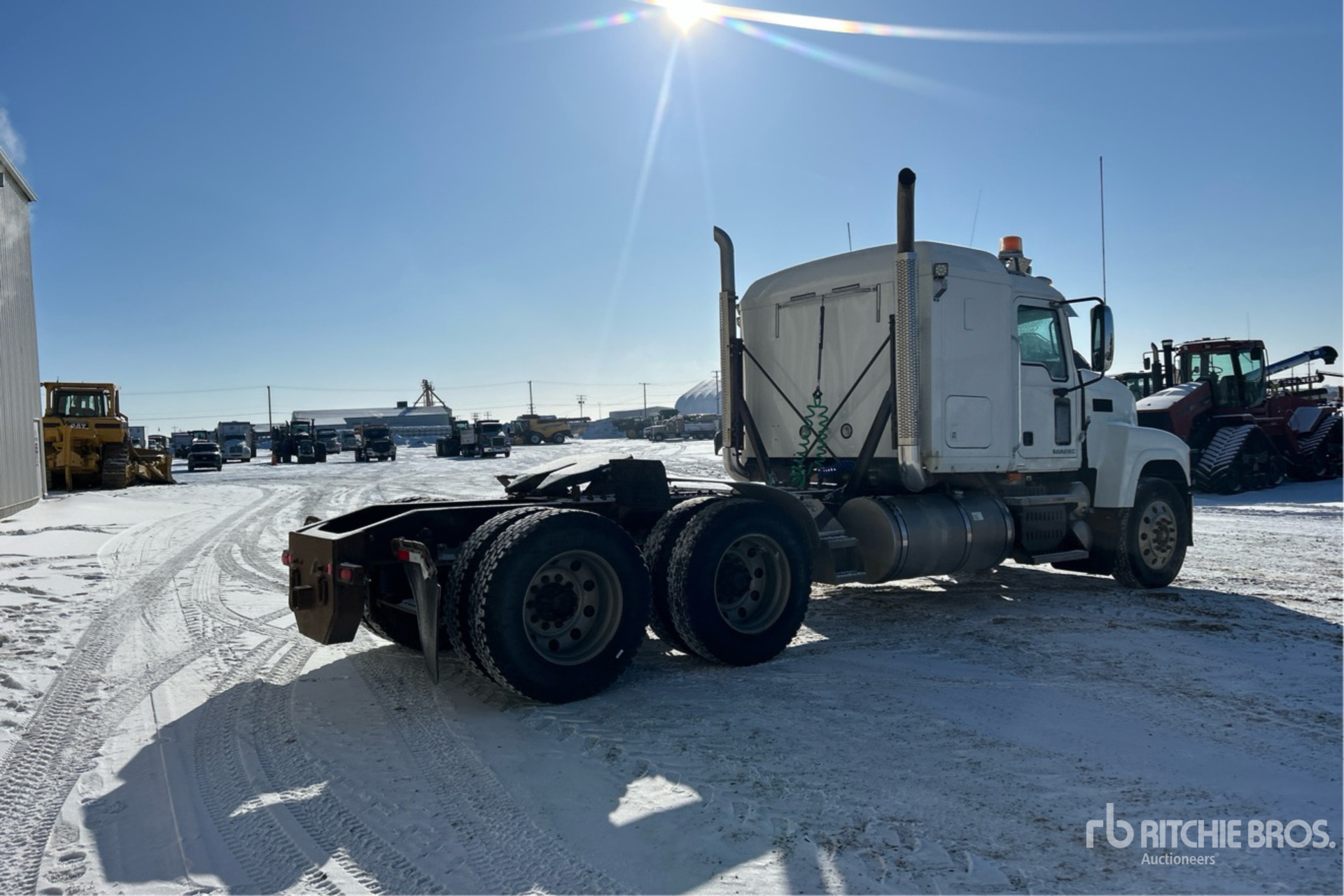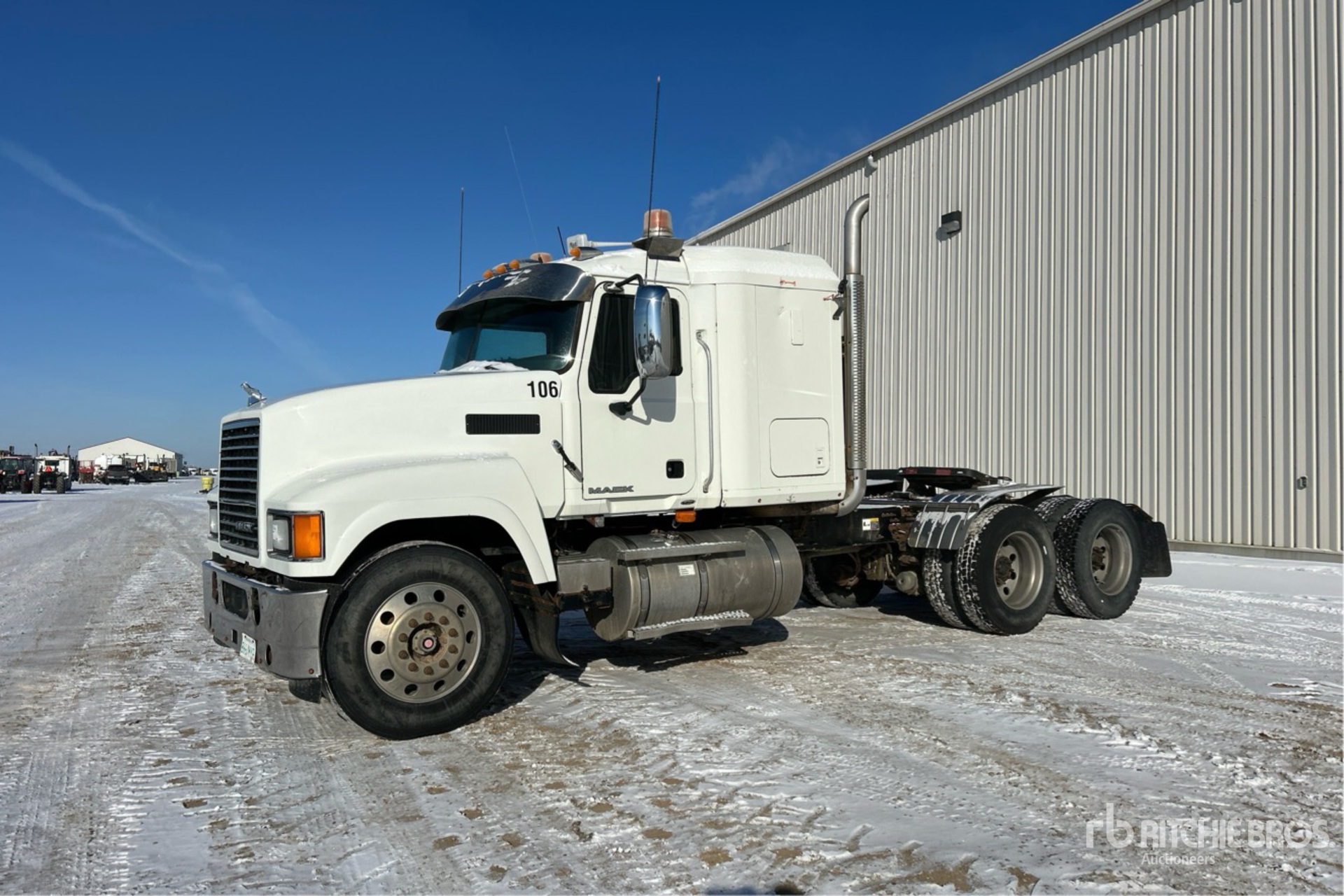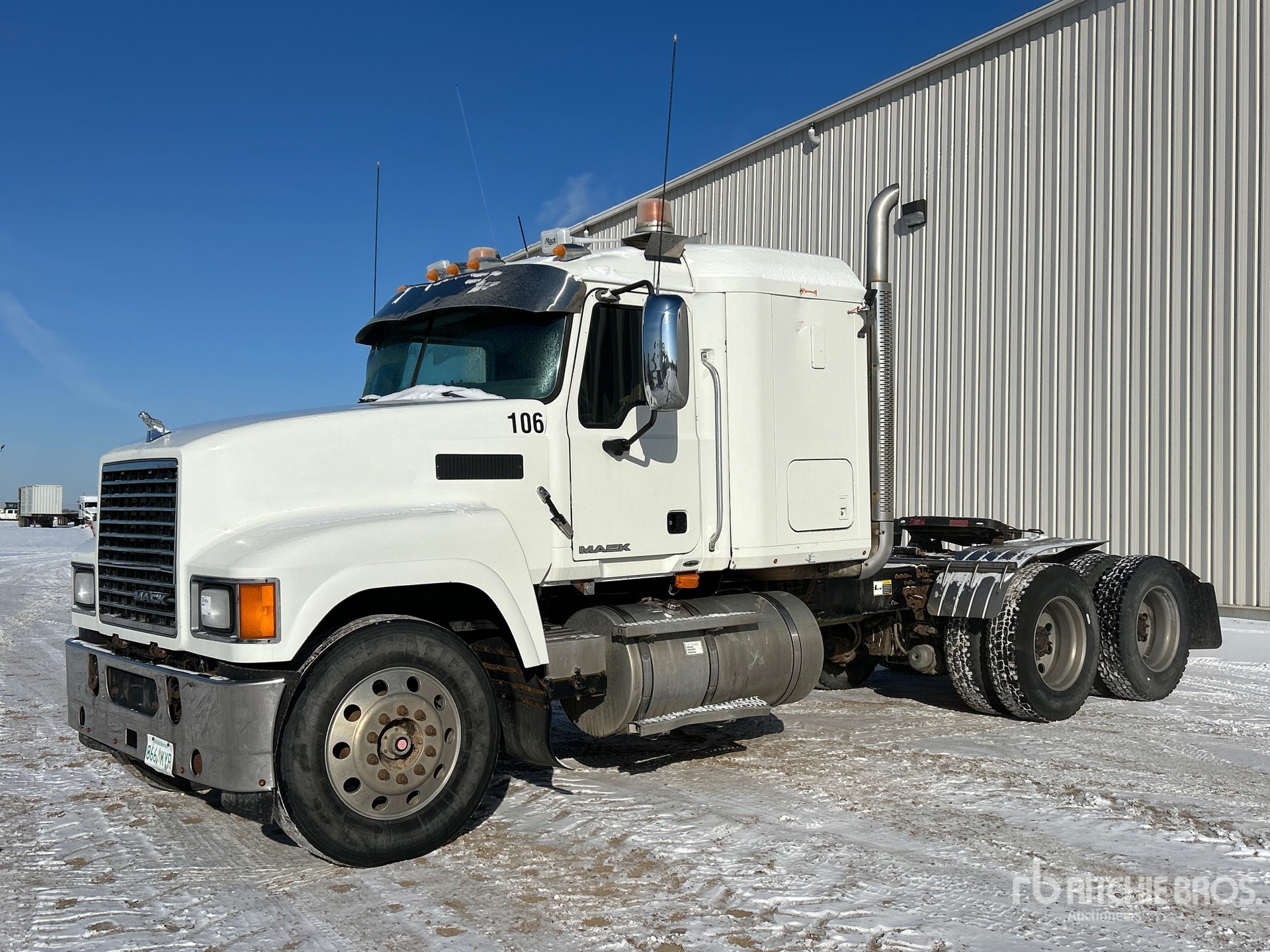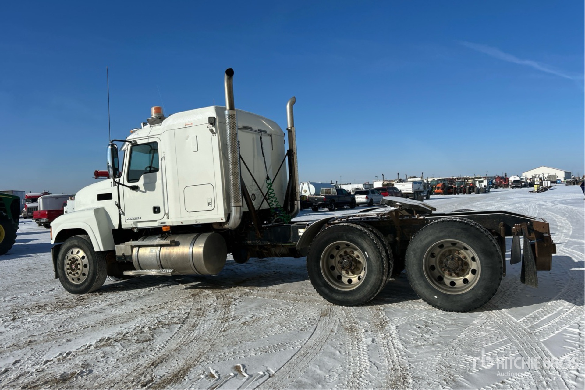 Mack MP8 338 hp Engine, 2009 US EPA Label, 10842 Engine hrs, Eaton Fuller 18-Speed Manual Transmission, 5443 kg Front Axle, 20866 kg Rears, 26309 kg GVWR, Engine Brake, Differential Lock, 48 in Mid Roof Sleeper Cab, 226 in Wheelbase, Air Suspension, Aluminum Wheels, 11R24.5, Air Sliding 5th Wheel, Dual Fuel Tanks