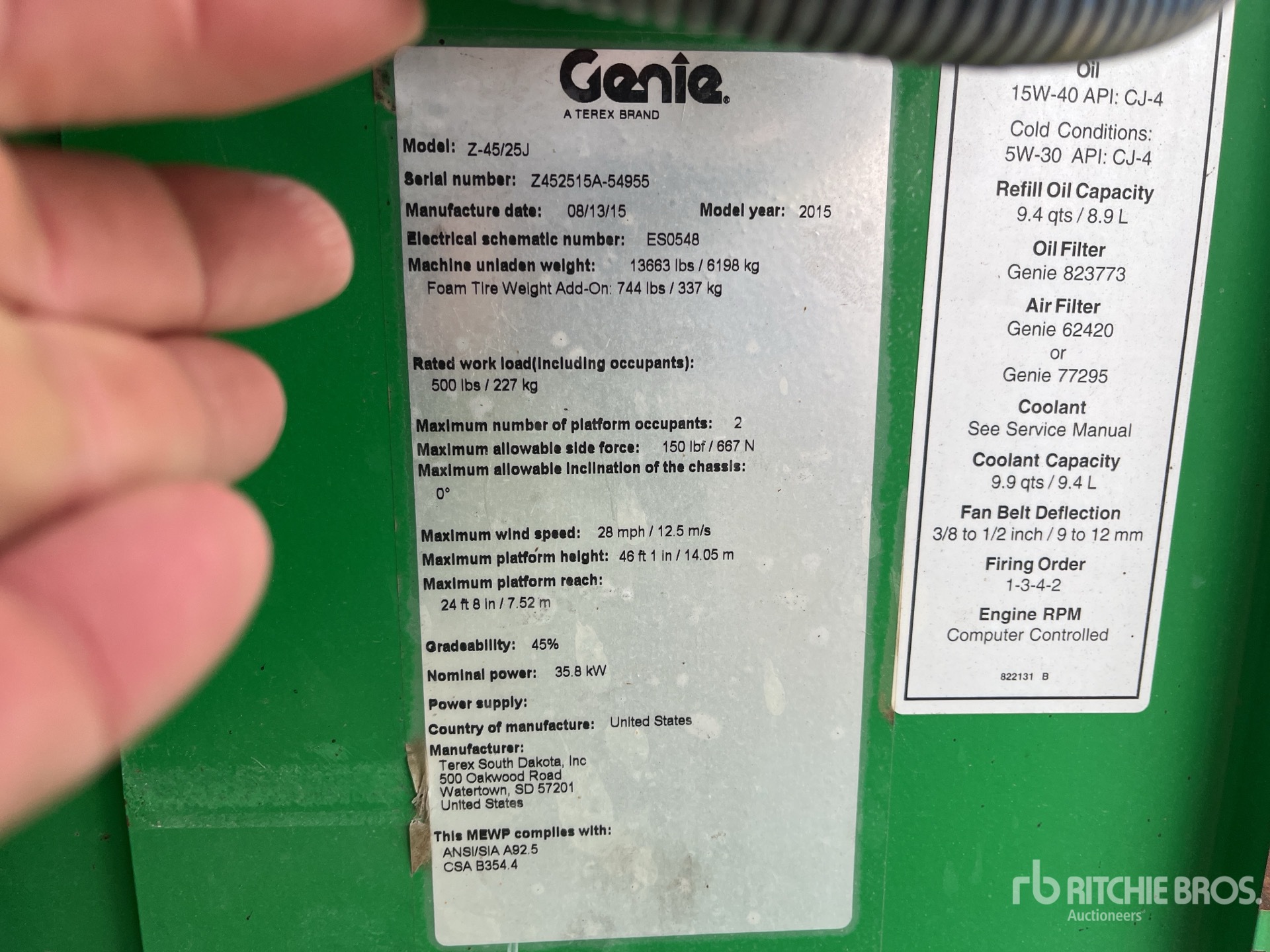 46 ft 1 in Max Platform Height, 500 lb Max Weight Capacity, Jib, Power to Platform, Tier 4, Deutz 4 Cylinder 74 hp 2.9 L Diesel Engine, Positive Air Shutoff, 9x14.5 Tires