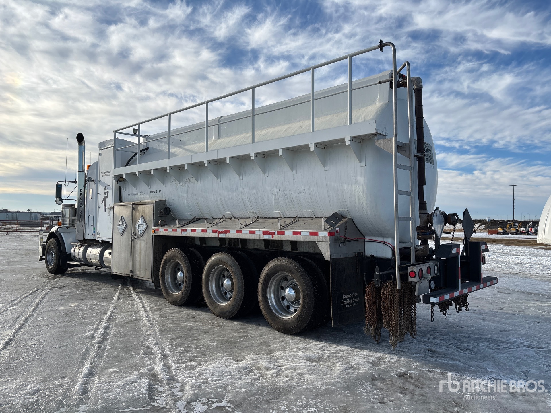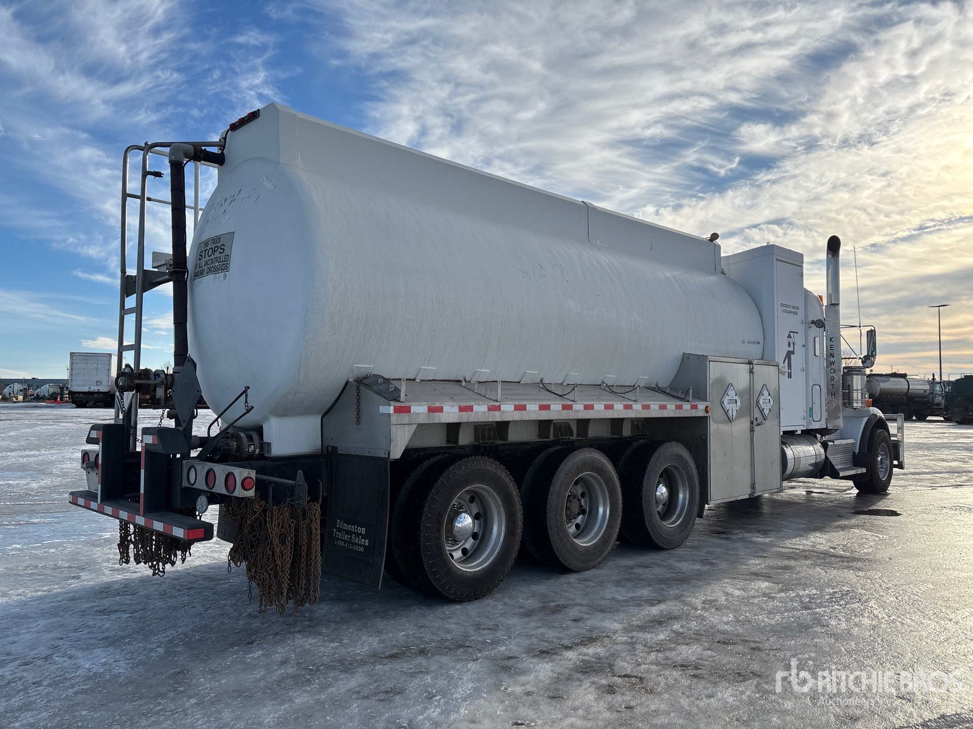 Cummins ISX15 6 Cylinder 15 L Diesel 525 hp Engine, Requires Diesel Exhaust Fluid, Positive Air Shutoff, Webasto Engine Coolant Heater, 24518 Engine hrs, Engine Brake, Eaton Fuller RTLO-18918B 18-Speed Manual Transmission, Triple Differential Locks, 19780 lb Front Axle, 64002 lb Rears, Dana T69-170HP Drive Axles, 4.30:1 Axle Ratio, 83782 lb GVWR, Air Ride Cab, 28 in Flat Top Sleeper Cab, Aluminum Wheels, 385/65R22.5 Front Tires, 11R24.5 Rear Tires, Dual Steering Boxes, Double Frame, Neway Air Ride Suspension, 306 in Wheelbase, 2014 Comptank 22670 L Steel Tank, 2 Compartments, TC412 Code, Catwalk w/Guardrails, Pintle Hitch