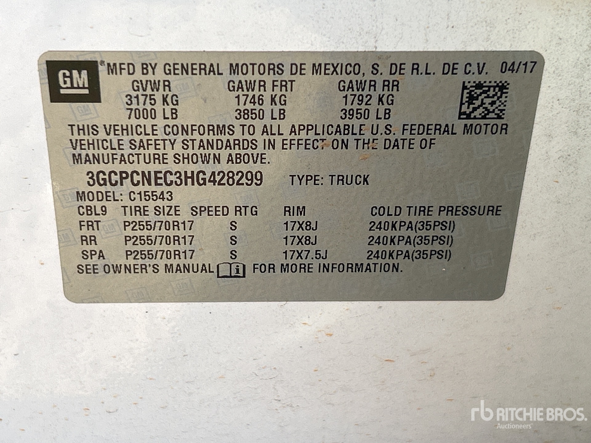 5.3 L V8 Gasoline Engine, 2017 US EPA Label, Automatic Transmission, Air Conditioner, Power Windows, Spray-On Bed Liner, 7000 lb GVWR, 225/70R17 Tires, 6 ft Bed