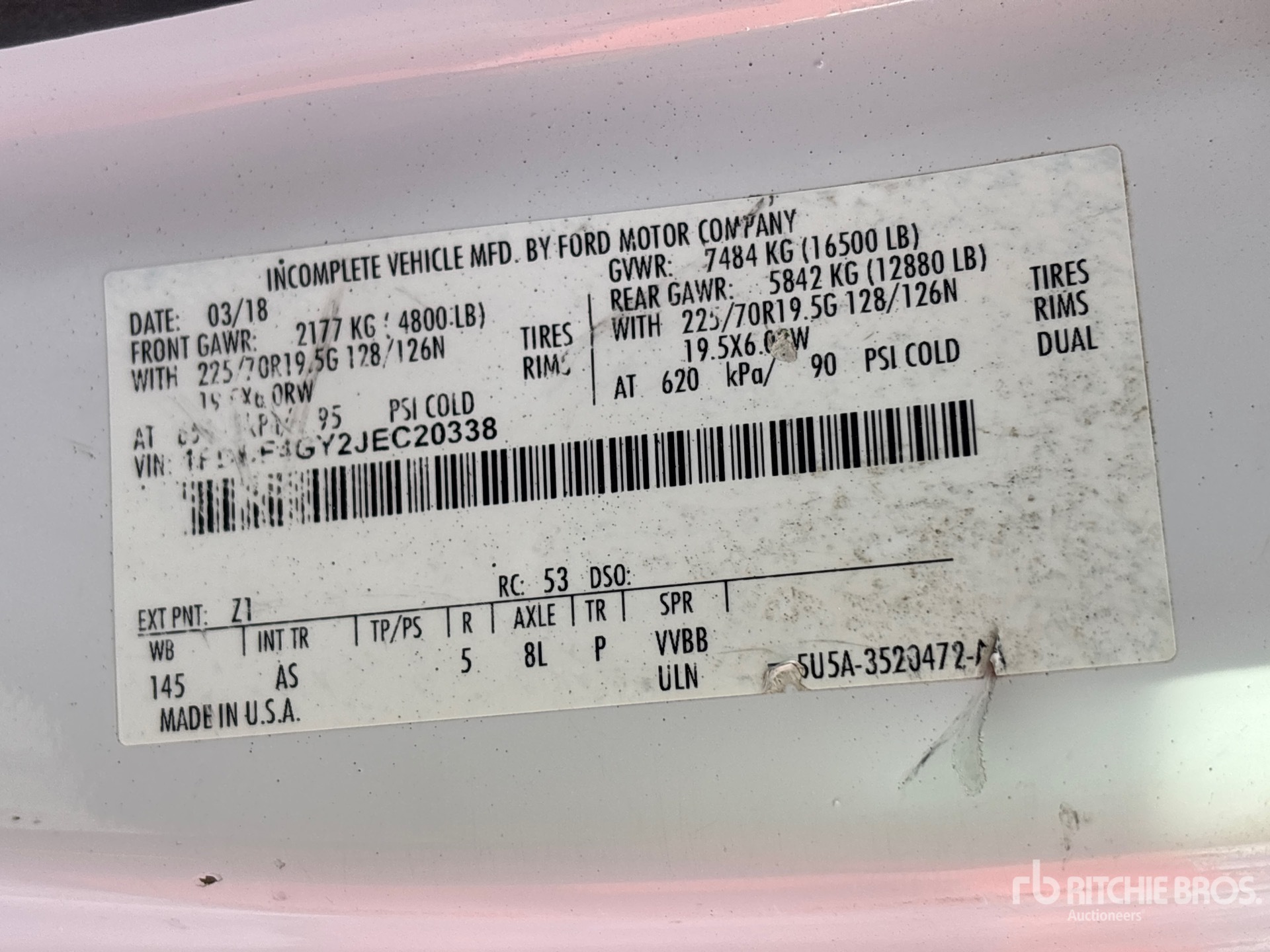 Located in Lane 23 Spot 17, Ford V10 6.8 L Gasoline Engine, 2018 US EPA Label, Automatic Transmission, 4800 lb Front Axle, 12880 lb Rears, 16500 lb GVWR, 225/70R19.5, Spring Suspension, 145 in Wheelbase, 9 ft x 93 in Bed