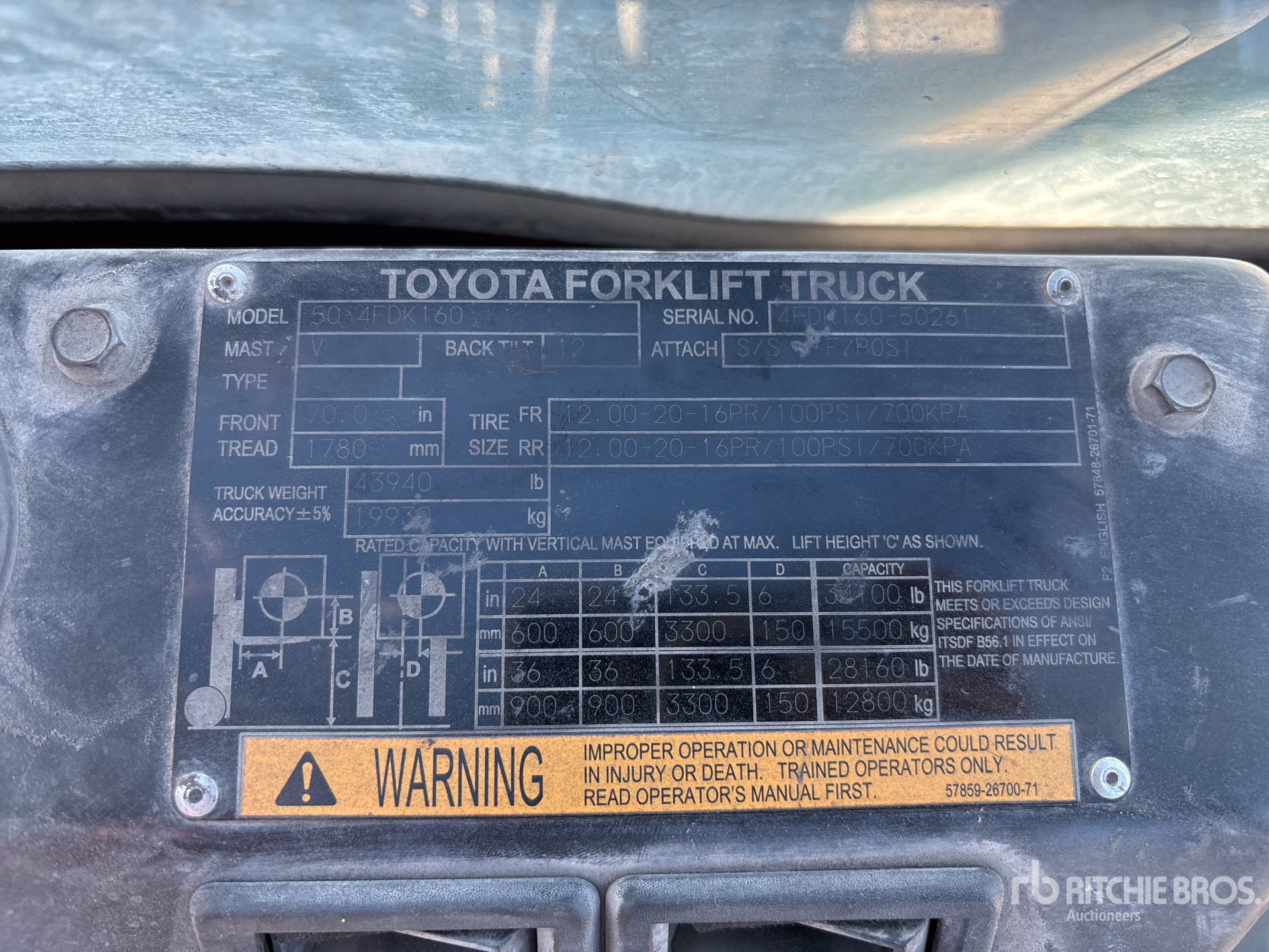 The detailed equipment information is limited in scope, and Ritchie Bros. Auctioneers has not inspected any aspects or components of the equipment other than those expressly set forth herein. Unless expressly stated, we make no representations or warranties, express or implied, concerning the equipment or its components, including without limitation any representations or warranties concerning functionality, conformity or compliance with any safety standard or requirement of any applicable authority or regulatory body, fitness for any particular purpose, or merchantability. You are strongly advised to perform your own detailed inspection of the equipment prior to bidding.