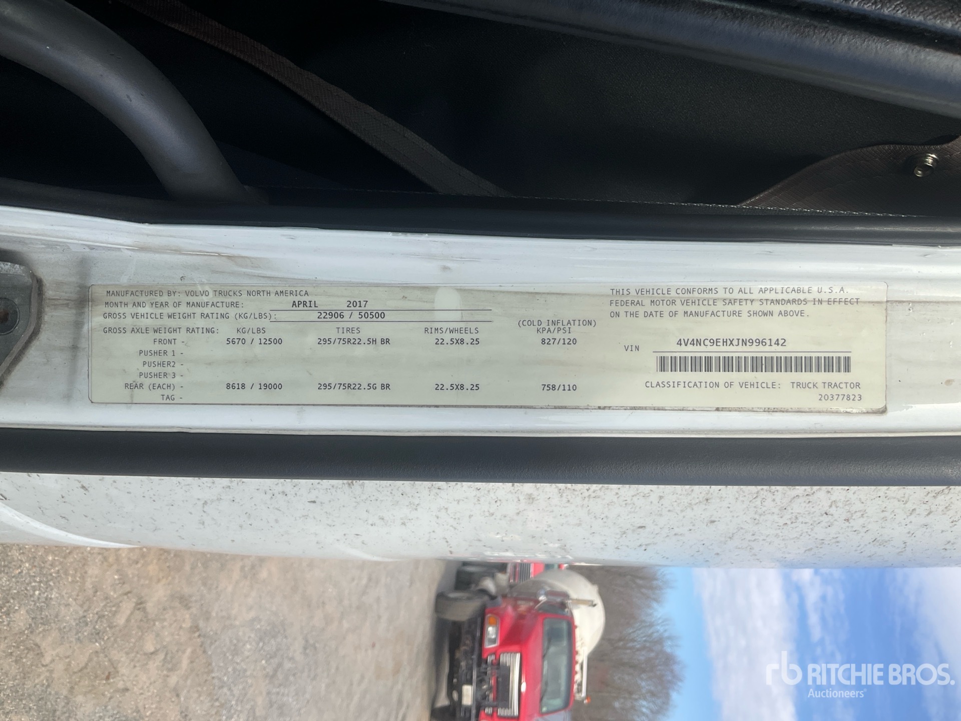 Volvo D13M 455 hp Engine, 2017 US EPA Label, 190326 Engine hrs, Volvo ATO2612F 12-Speed Automated Transmission, 12500 lb Front Axle, 38000 lb Rears, 50500 lb GVWR, Engine Brake, 77 in High Rise Sleeper Cab, Bunk Beds, 238 in Wheelbase, Air Suspension, 295/75R22.5 Front Tires, 275/80R22.5 Rear Tires, Air Sliding 5th Wheel