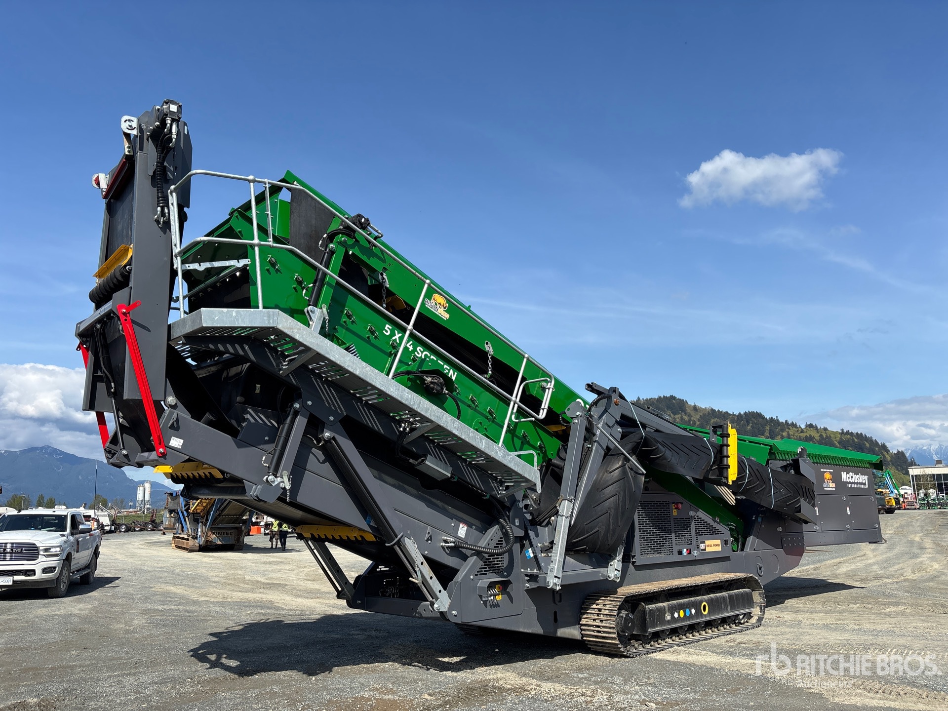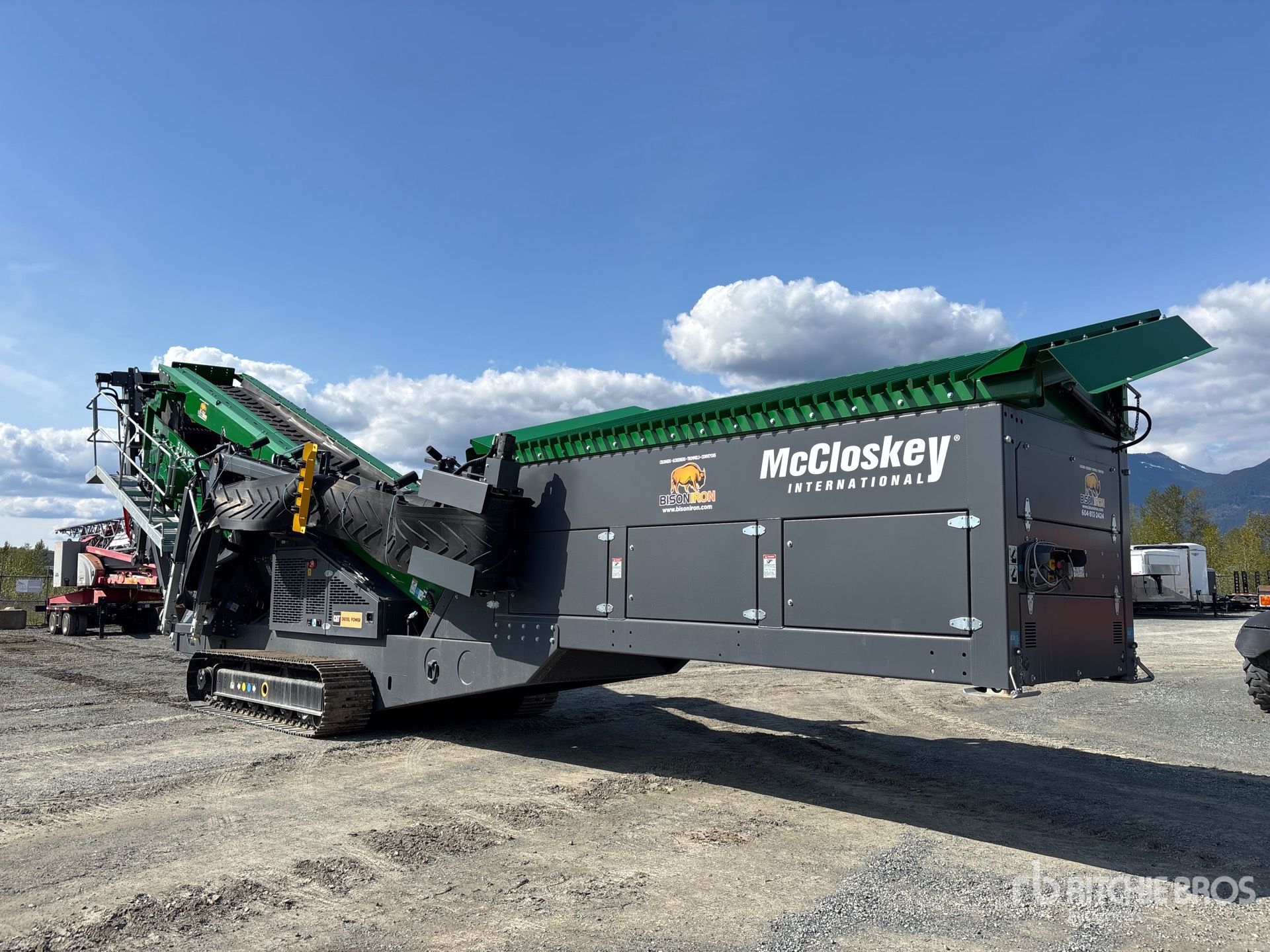 McCloskey 4 ft x 16 ft Belt Feeder w/Hydraulic Raise Grizzly 5 ft x 14 ft Double Deck Screen, 48 in Wide Feed Conveyor, 48 in Wide Fines Discharge Conveyor, 26 in Wide Left Discharge Conveyor, 26 in Wide Right Discharge Conveyor, Radio and Cable Remote Control, 2024 US EPA Label, CARB Compliant, Cat C4.4 4.4 L Diesel Engine, Requires Diesel Exhaust Fluid, 19.5 in Triple Grouser Track Shoes, Remote Tipping Grizzly, 40 in Wide Main Conveyor