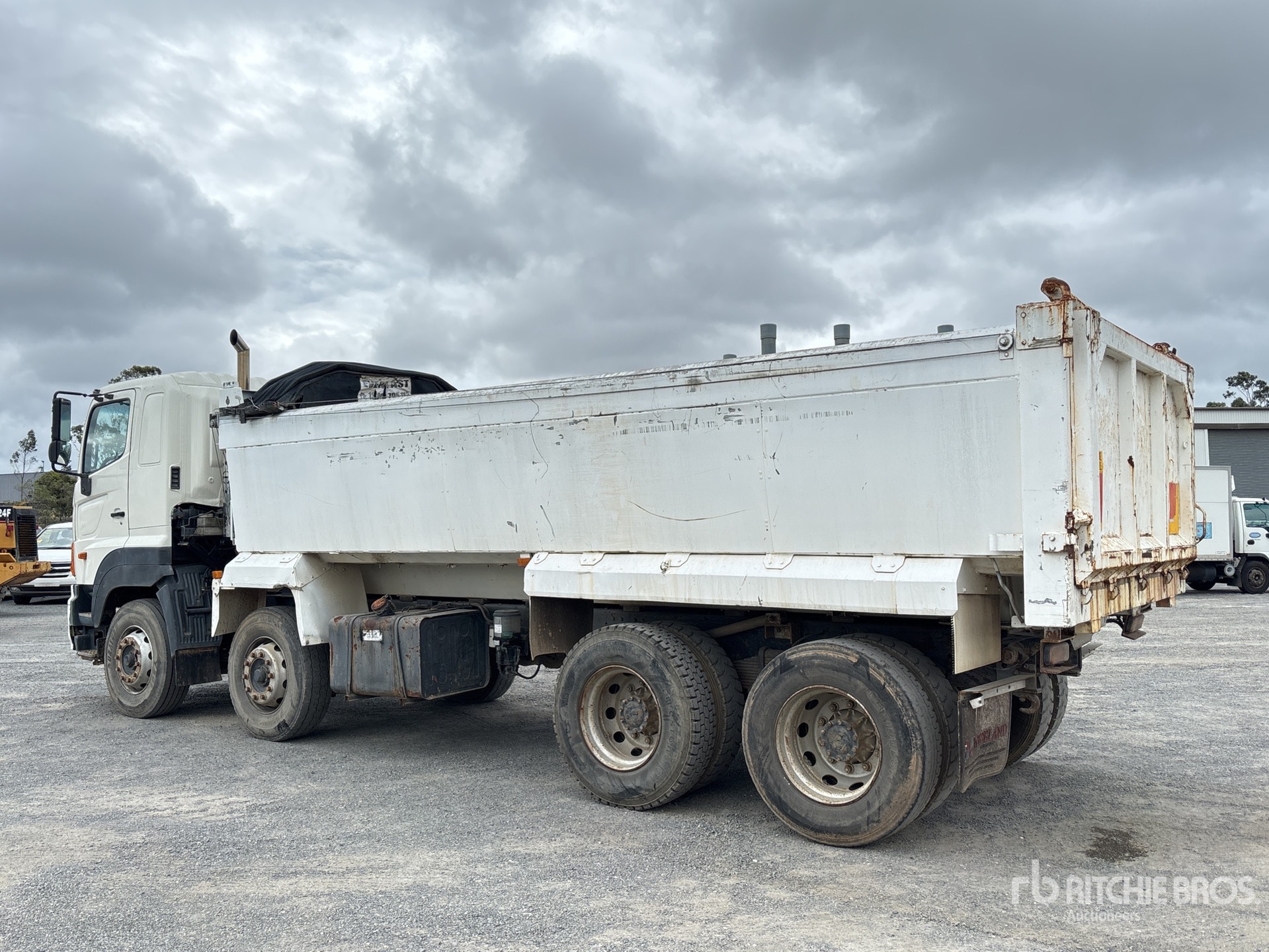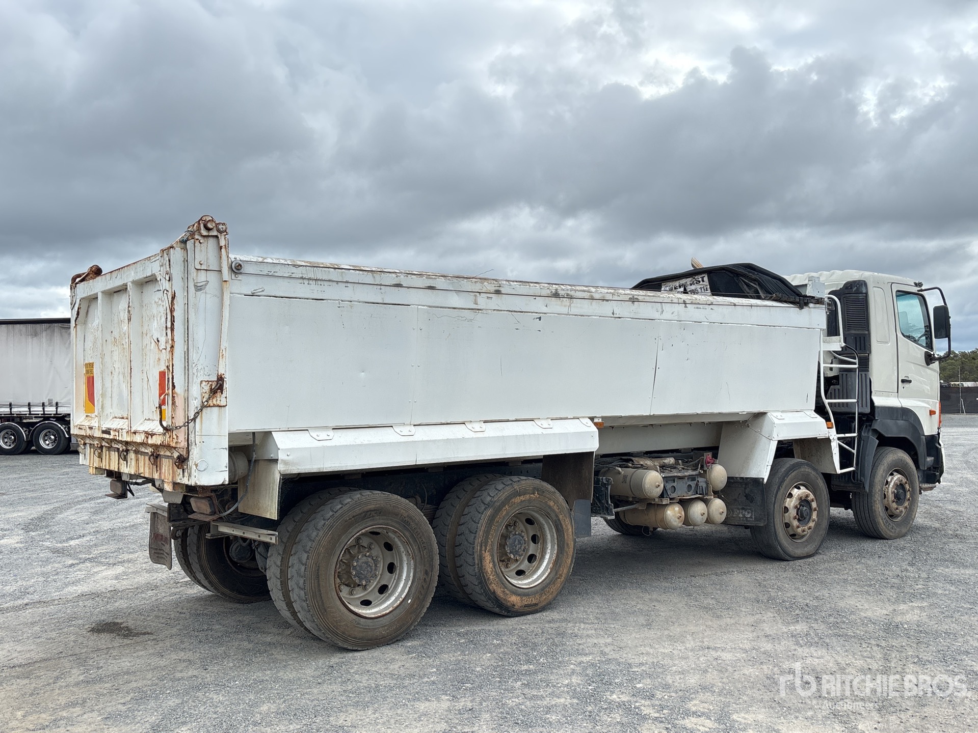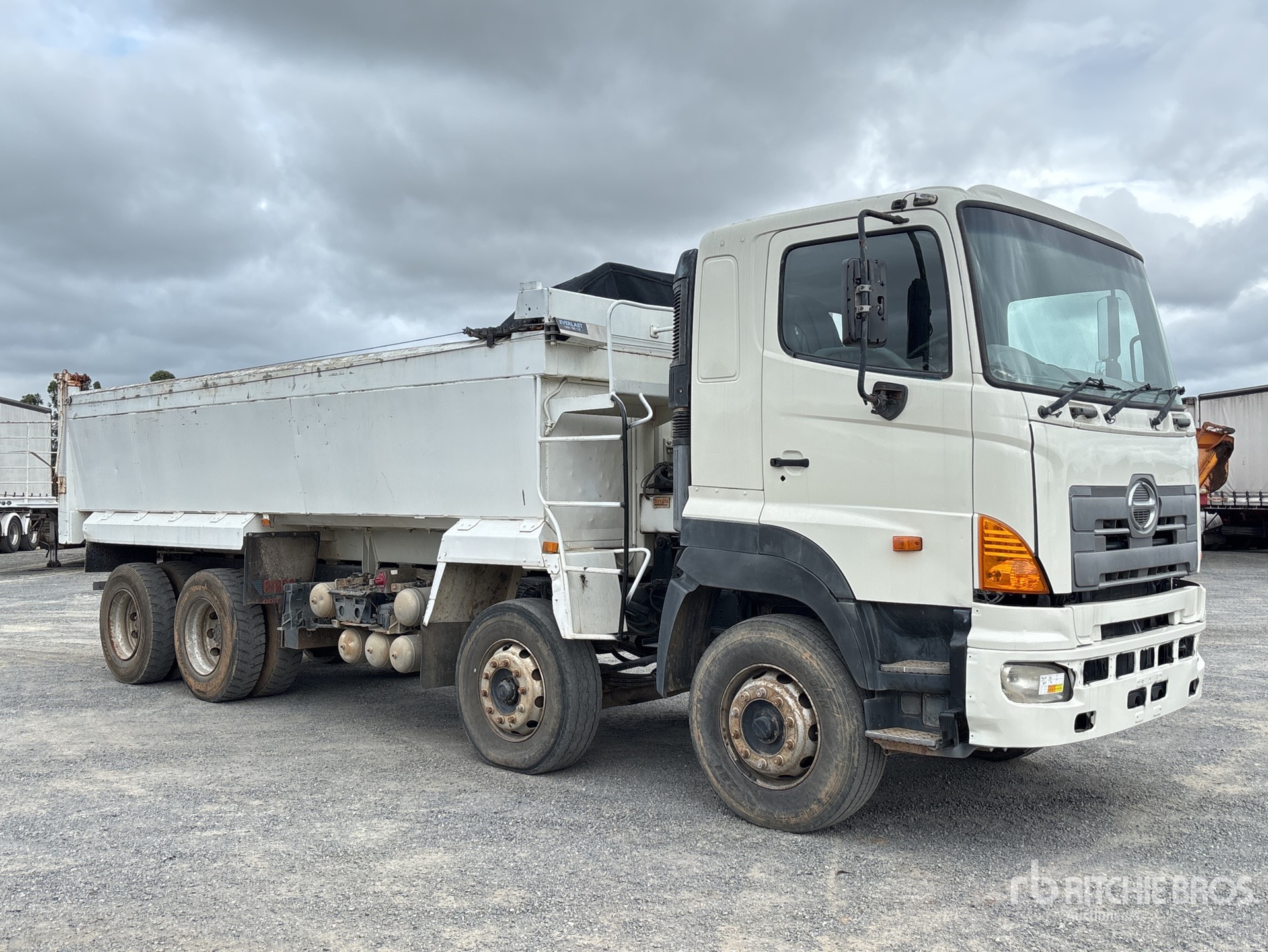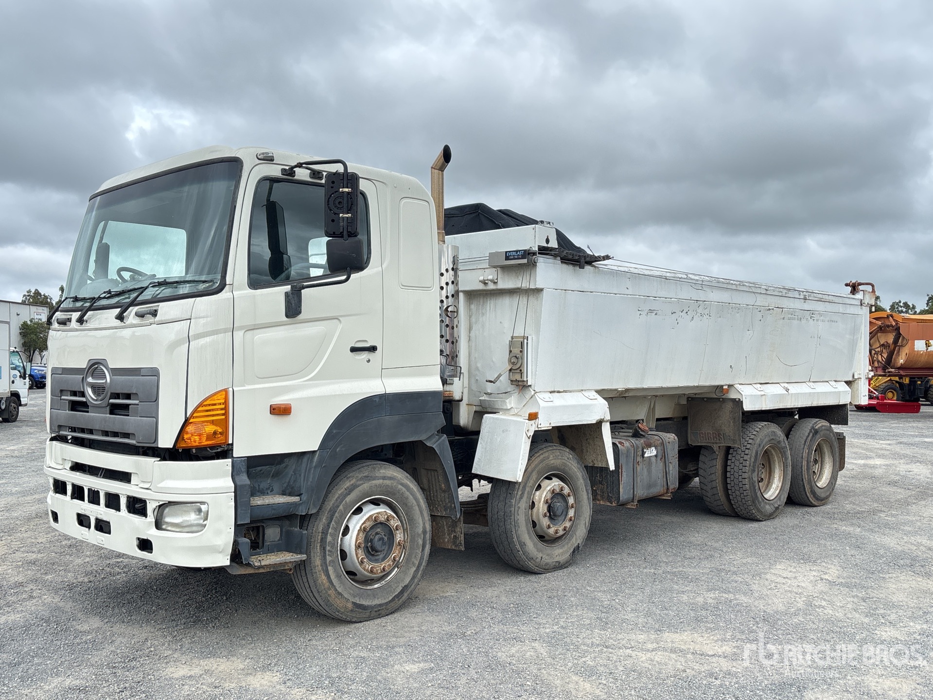 Hino 6 Cylinder Engine, Exhaust Brake, 16-Speed Manual Transmission, 295/80R22.5 Front Tires, 11R22.5 Rear Tires, 6-Rod Suspension, 6000 mm Wheelbase, PTO, Hydraulic System, 6300 mm Long x 1000 mm High Alloy Body, Auto Lube System, Manual Roll Tarp, 2-Way Tailgate