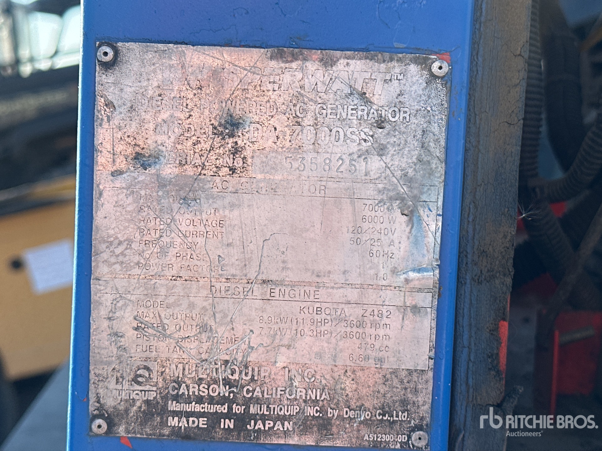 Tier 4, 2010 US EPA Label, Kubota 2 Cylinder 9.9 kW Diesel Engine, /7.0 kW, Rated Single Phase Output, 240 V / 120 V Rated Voltage, 240 V & 120 V Receptacles, Ball Hitch Carrier Trailer